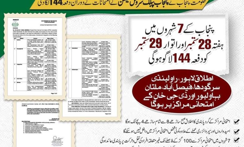 لاہور(ٹی این آئی)پنجاب کے 7 شہروں میں دفعہ 144 کا نفاذ کر دیا۔حکومت پنجاب نے پبلک سروس کمیشن کے امتحانات کے دوران ہفتہ 28 ستمبر اور اتوار 29 ستمبر کو دفعہ 144 لگادی۔ لاہور، راولپنڈی، سرگودھا، فیصل آباد، ملتان، بہاولپور اور ڈی جی خان میں قائم امتحانی مراکز سے 100 گز کے فاصلے تک امیدواروں اور سپروائزری عملے کے علاوہ غیر متعلقہ افراد کی نقل و حرکت پر پابندی عائد۔ امتحانی مراکز کے گرد پابندی کا اطلاق صبح ساڑھے 8 سے شام ساڑھے 4 بجے تک ہوگا