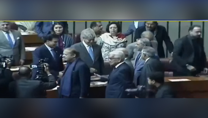 اس موقع پر لیگی رہنماؤں نے پارلیمنٹ پہنچنے پر نواز شریف کا ڈیسک بجاکر شاندار استقبال کیا۔نواز شریف نے ایوان میں ارکان اسمبلی سے ہاتھ ملایا جبکہ بلاول بھٹو زرداری نے نواز شریف کی نشست پر جا کر ان سے مصافحہ کیا۔