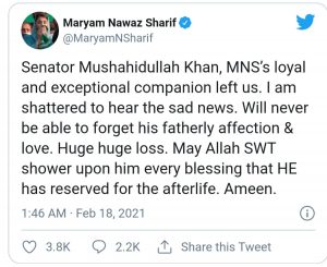 مریم نواز نے کہا کہ سینیٹرمشاہداللہ خان کے انتقال کی خبر سن کر ان کو دھچکا لگا، ان کا انتقال مسلم لیگ ن کے لیے بڑا نقصان ہے۔